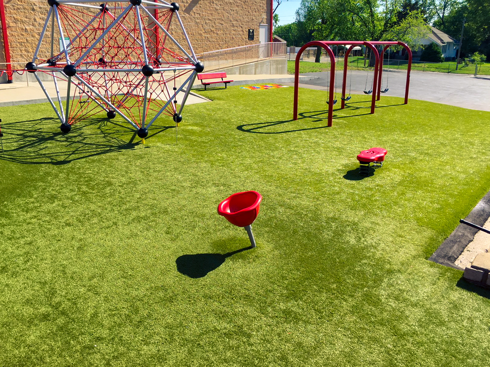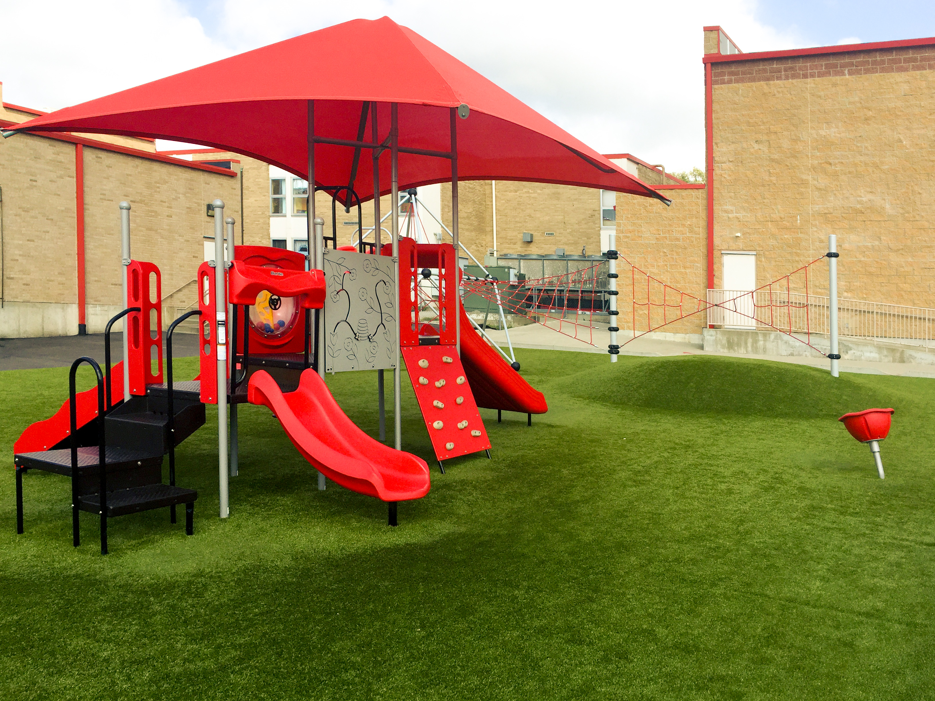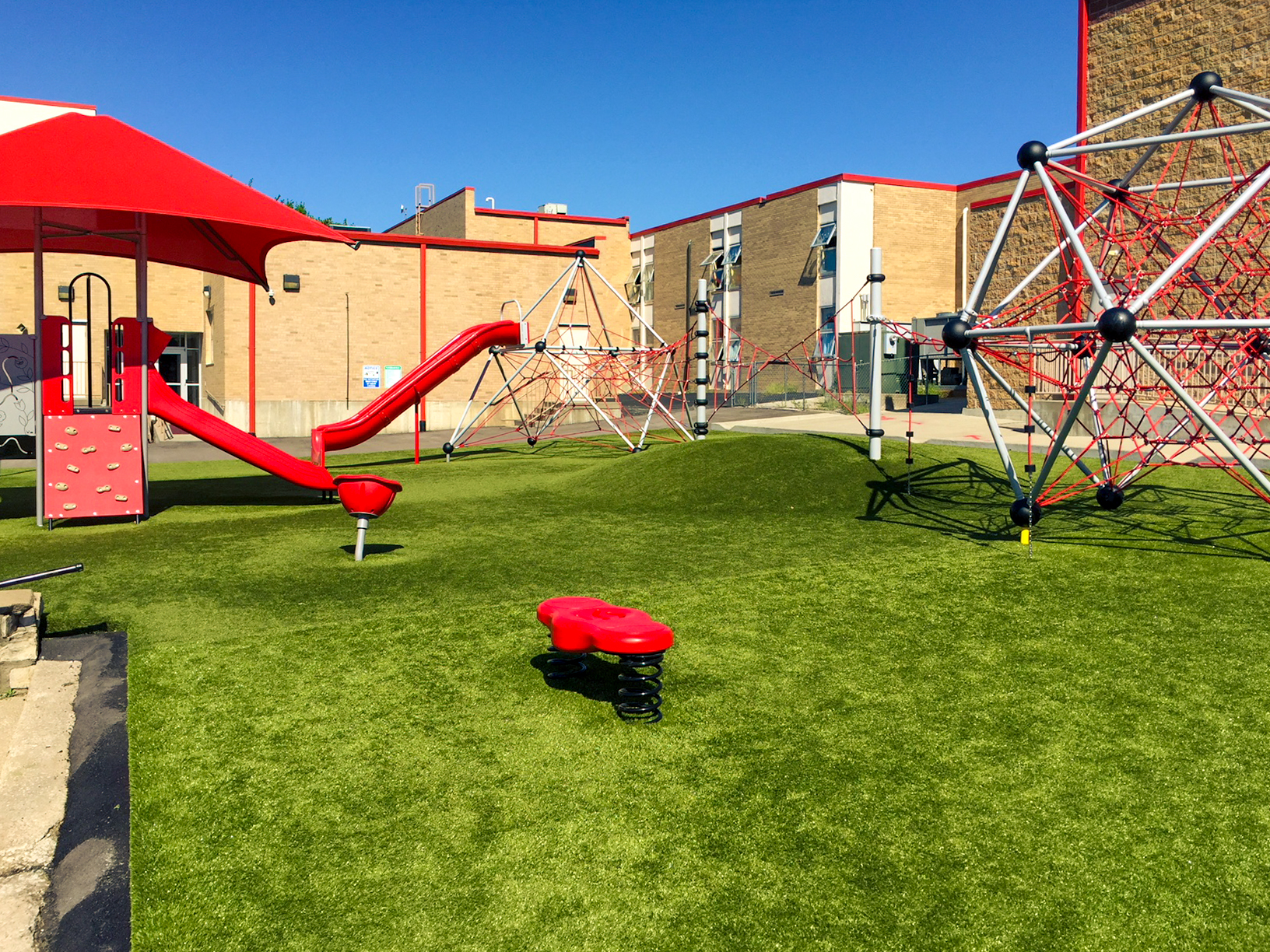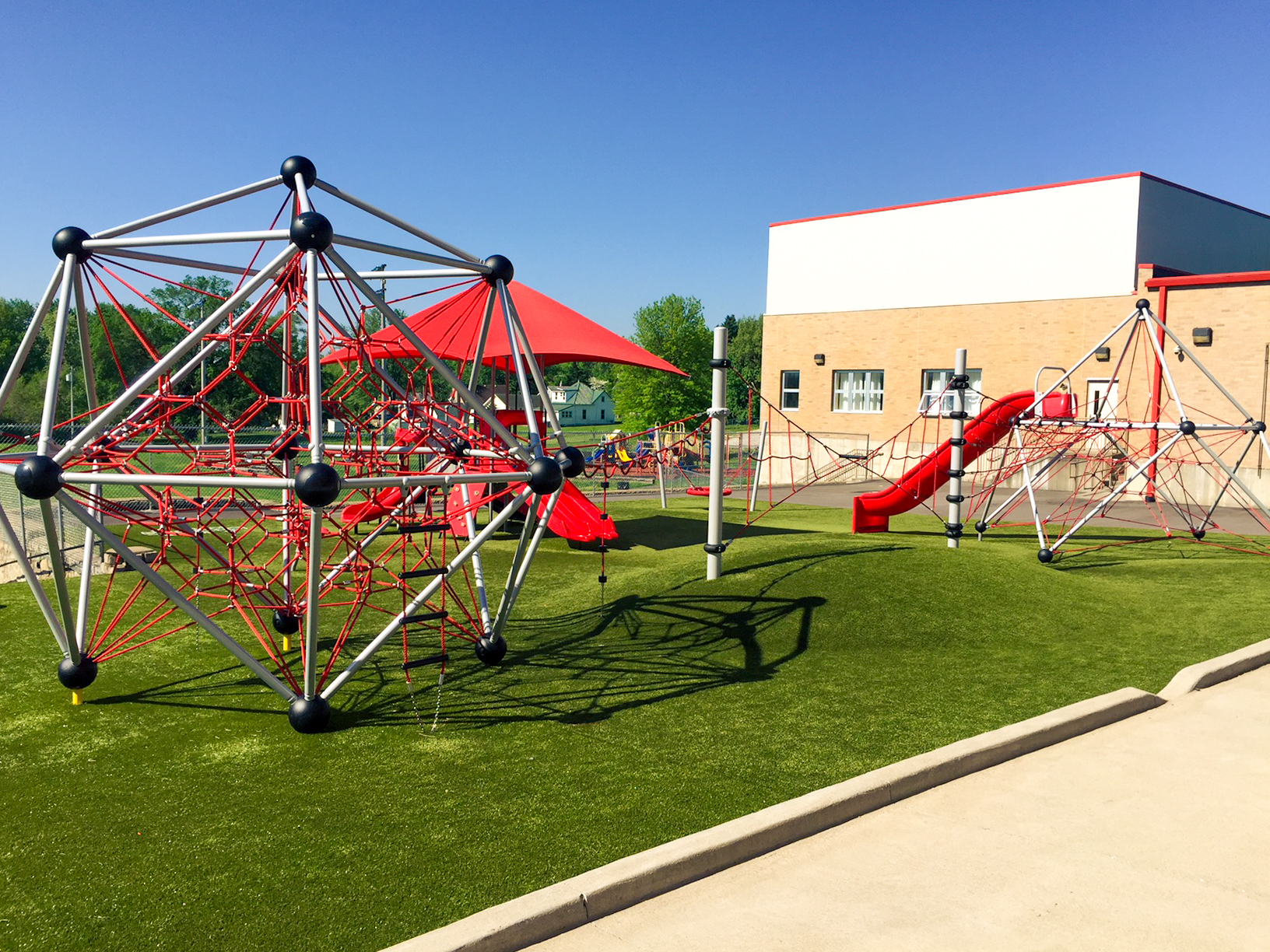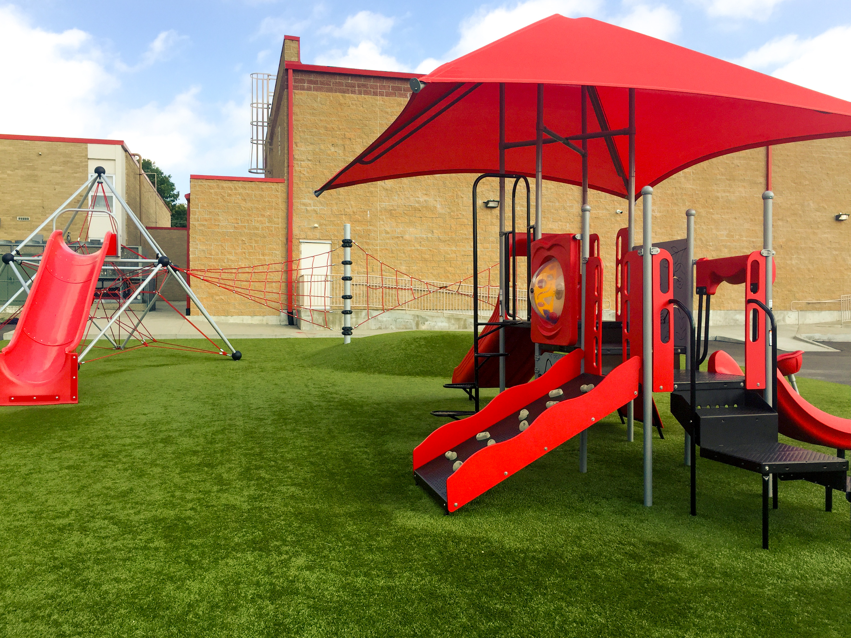 Dear Elementary's playground brings together a layered play environment built around Superior Play equipment, Superior Shade structures, and ForeverLawn Playground Turf. Rope climbing structures anchor the active zones, while ForeverLawn funserts featuring an alphabet design and hopscotch shape the surfacing into built-in play moments underfoot. Shade coverage and durable turf keep the space comfortable and usable across the full school day, from morning recess through after-school programs.