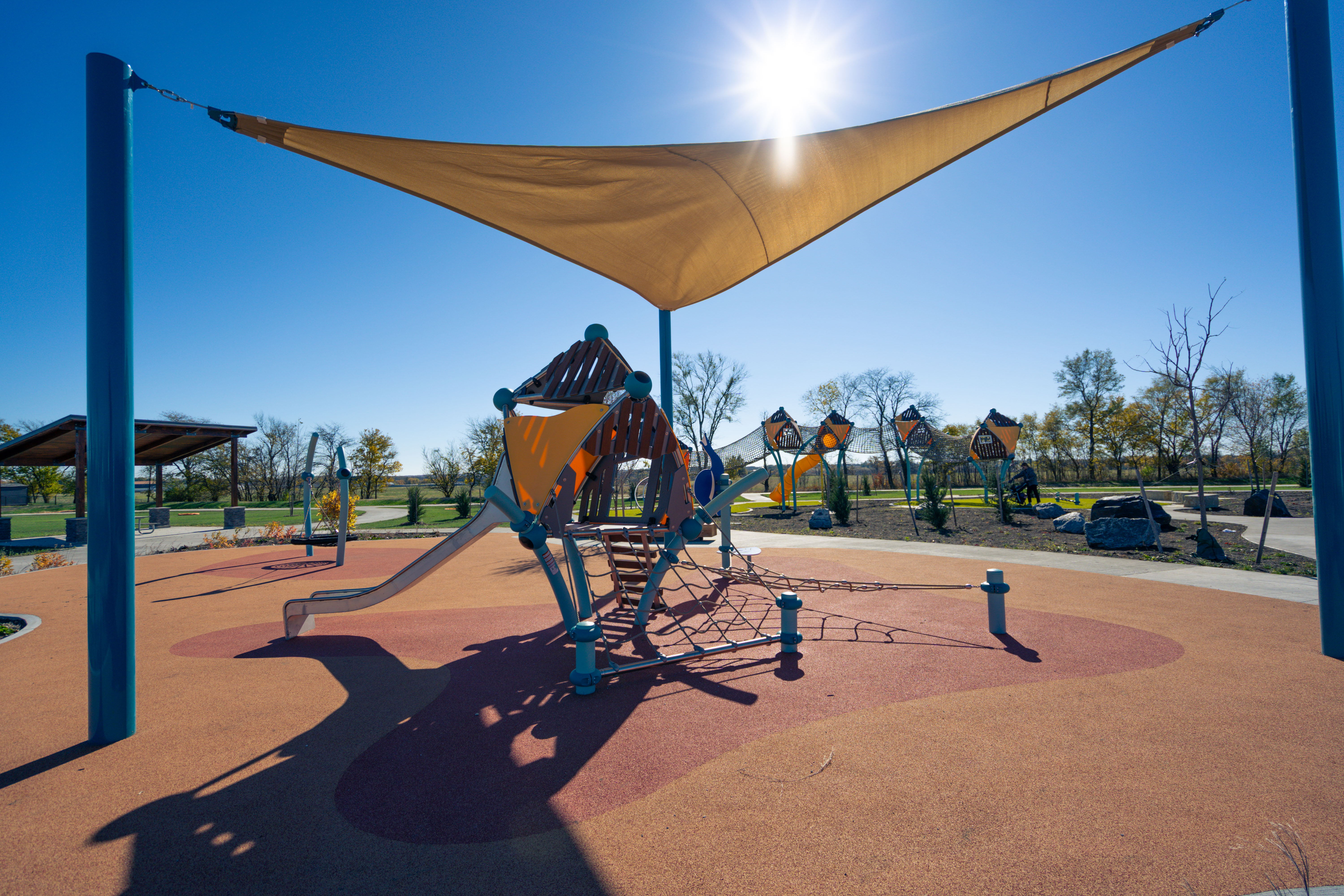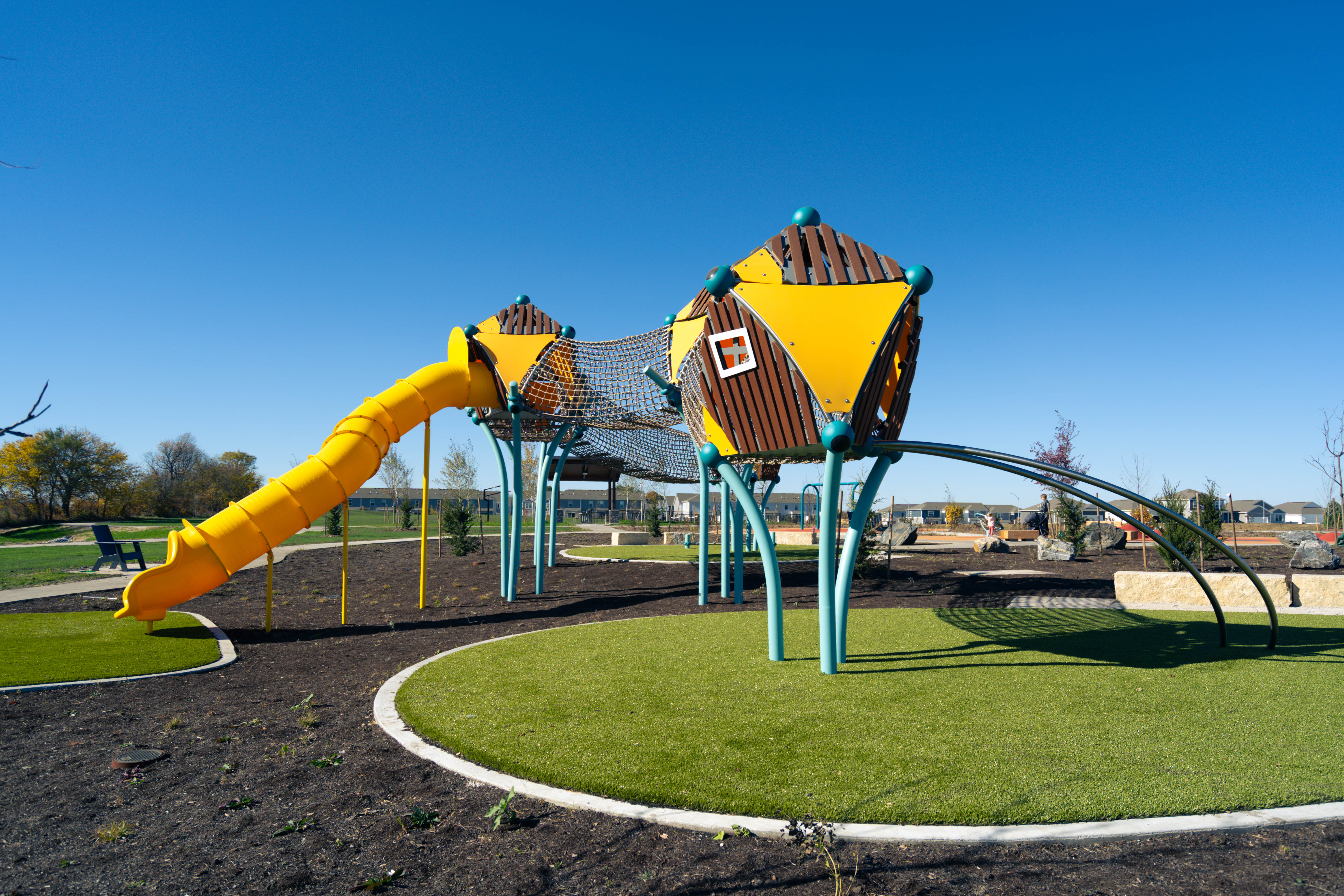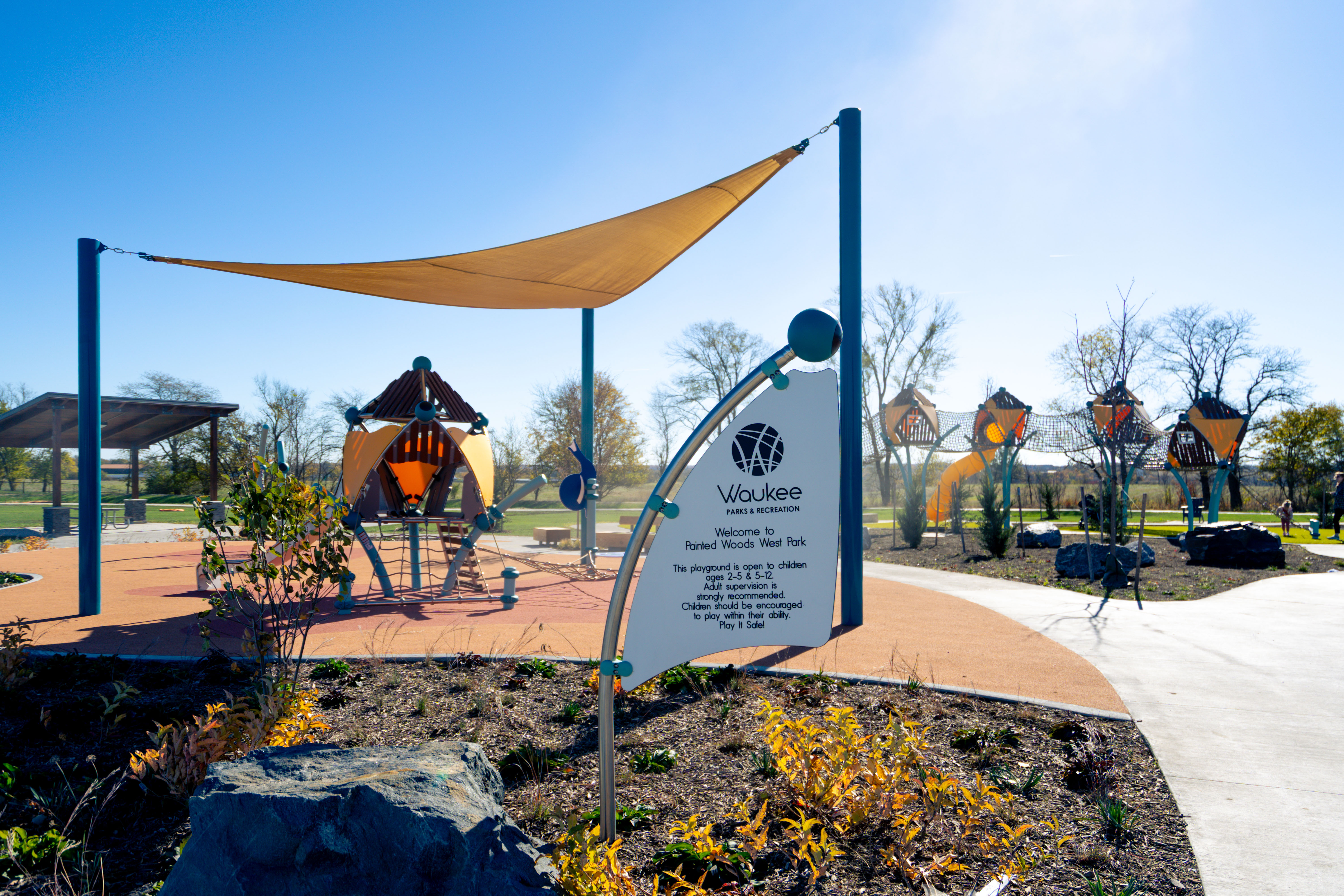 Painted Woods West Park in Waukee, Iowa, brings to life a vibrant, nature-inspired play environment designed for children of all abilities. Nestled within its 8.5 acres, the park features imaginative treehouse-style structures, a scenic walking trail, and a variety of inclusive play elements that encourage shared experiences.