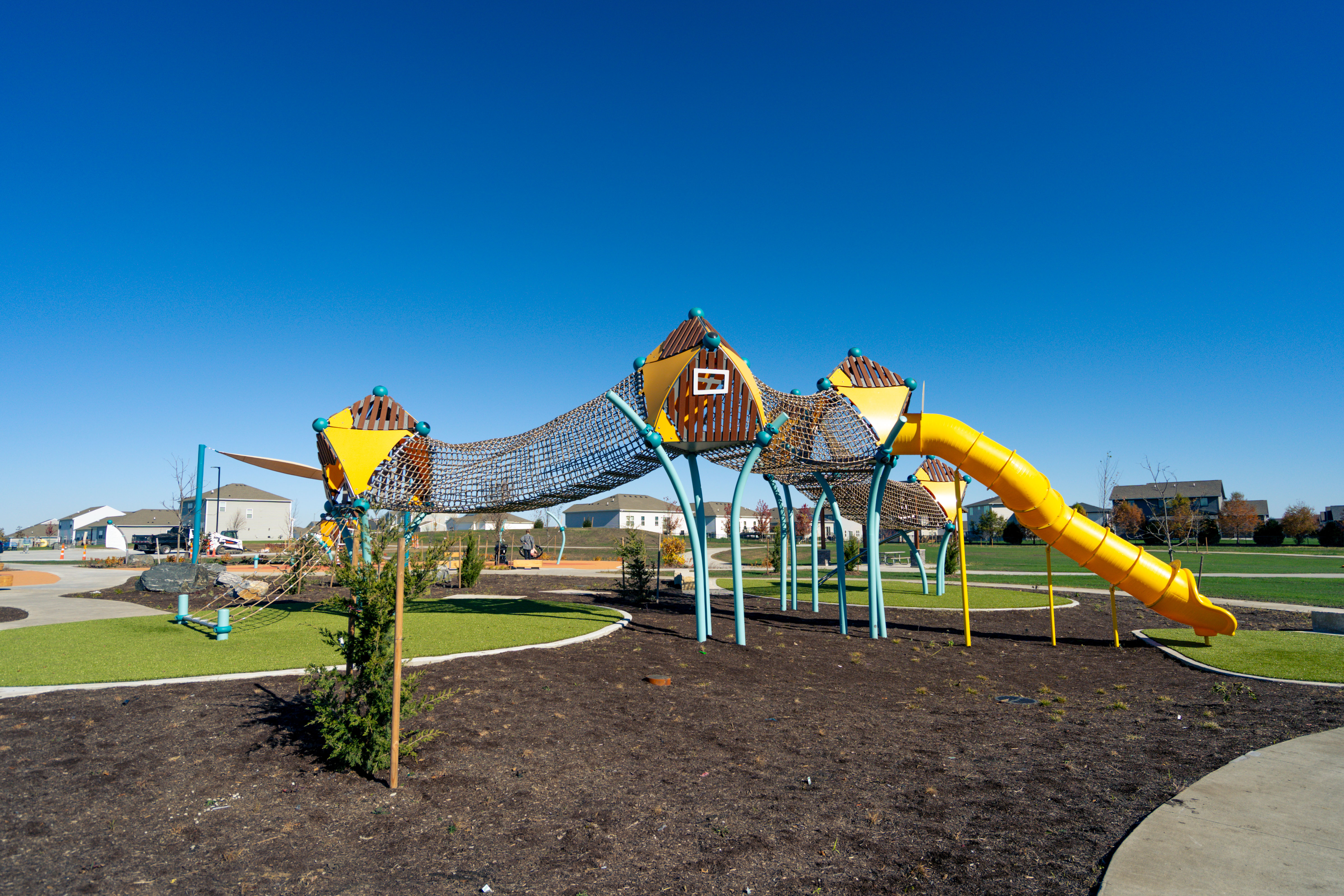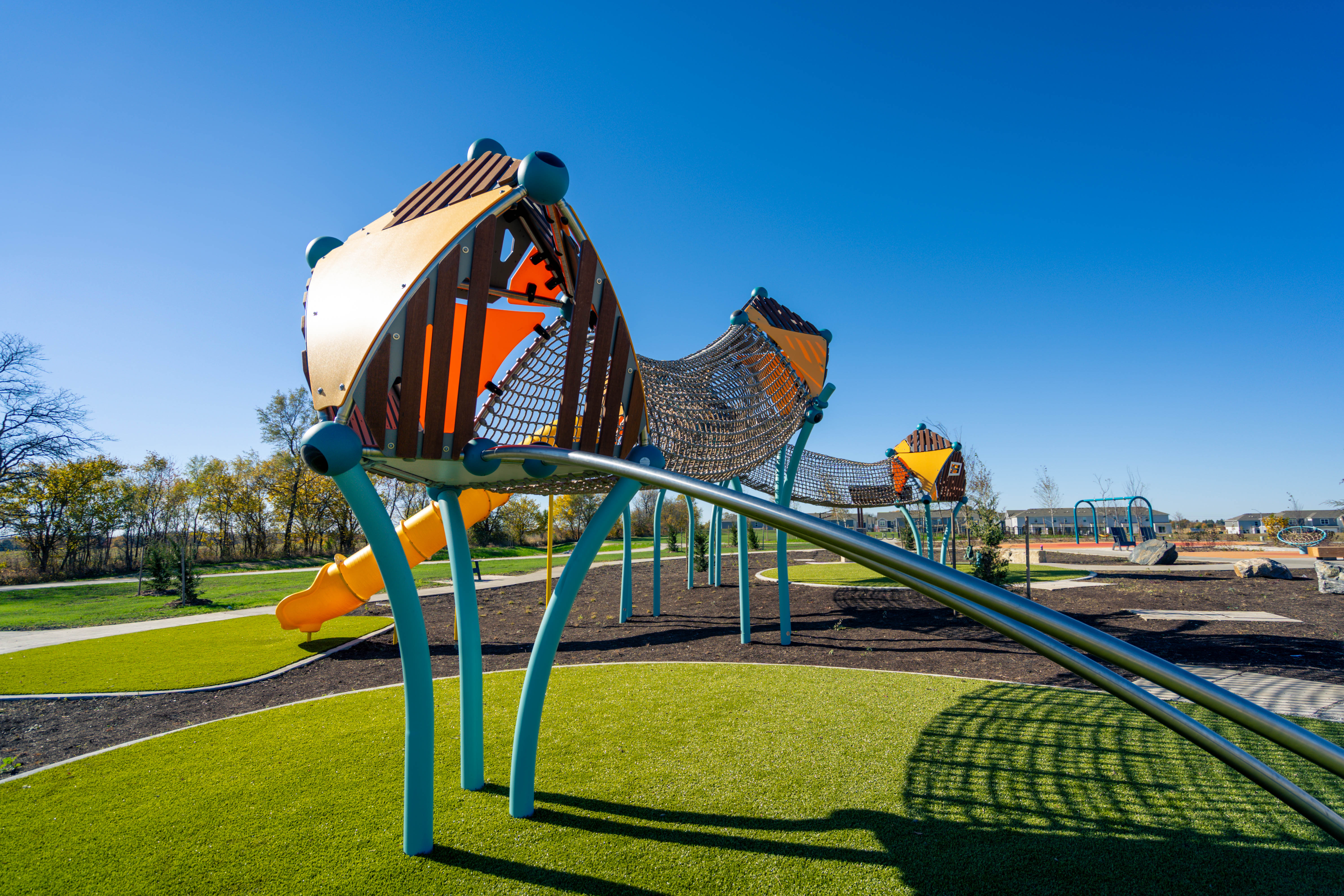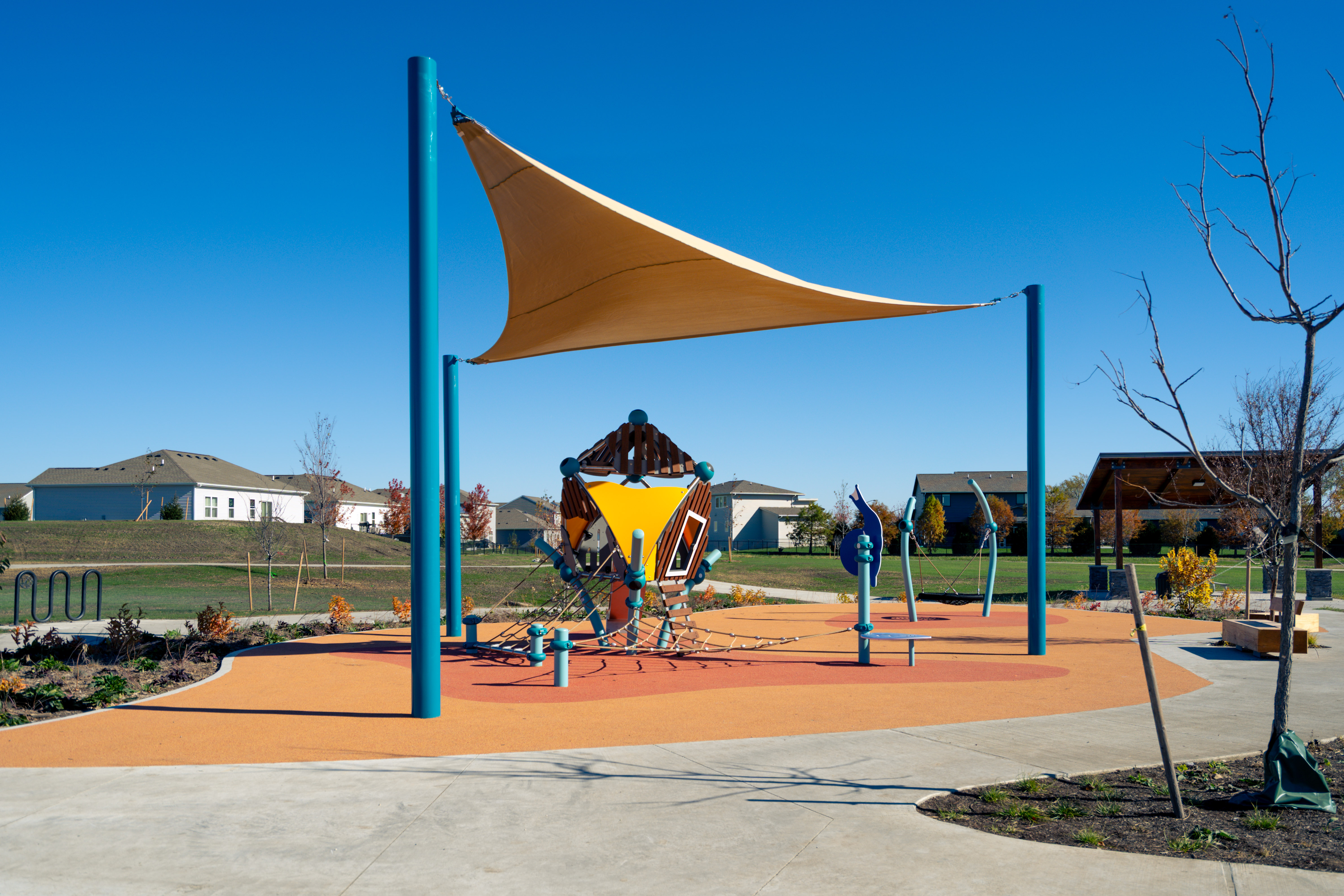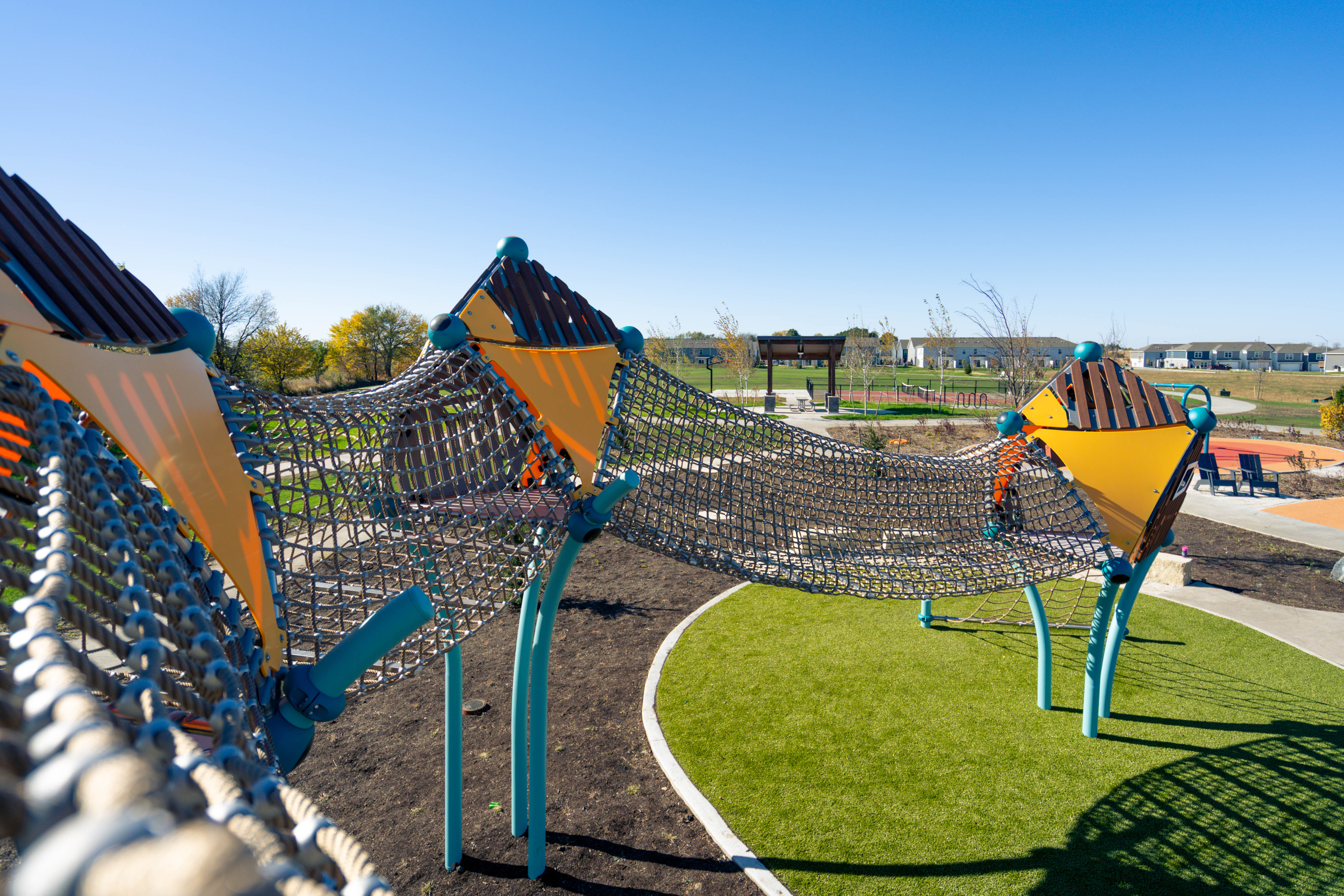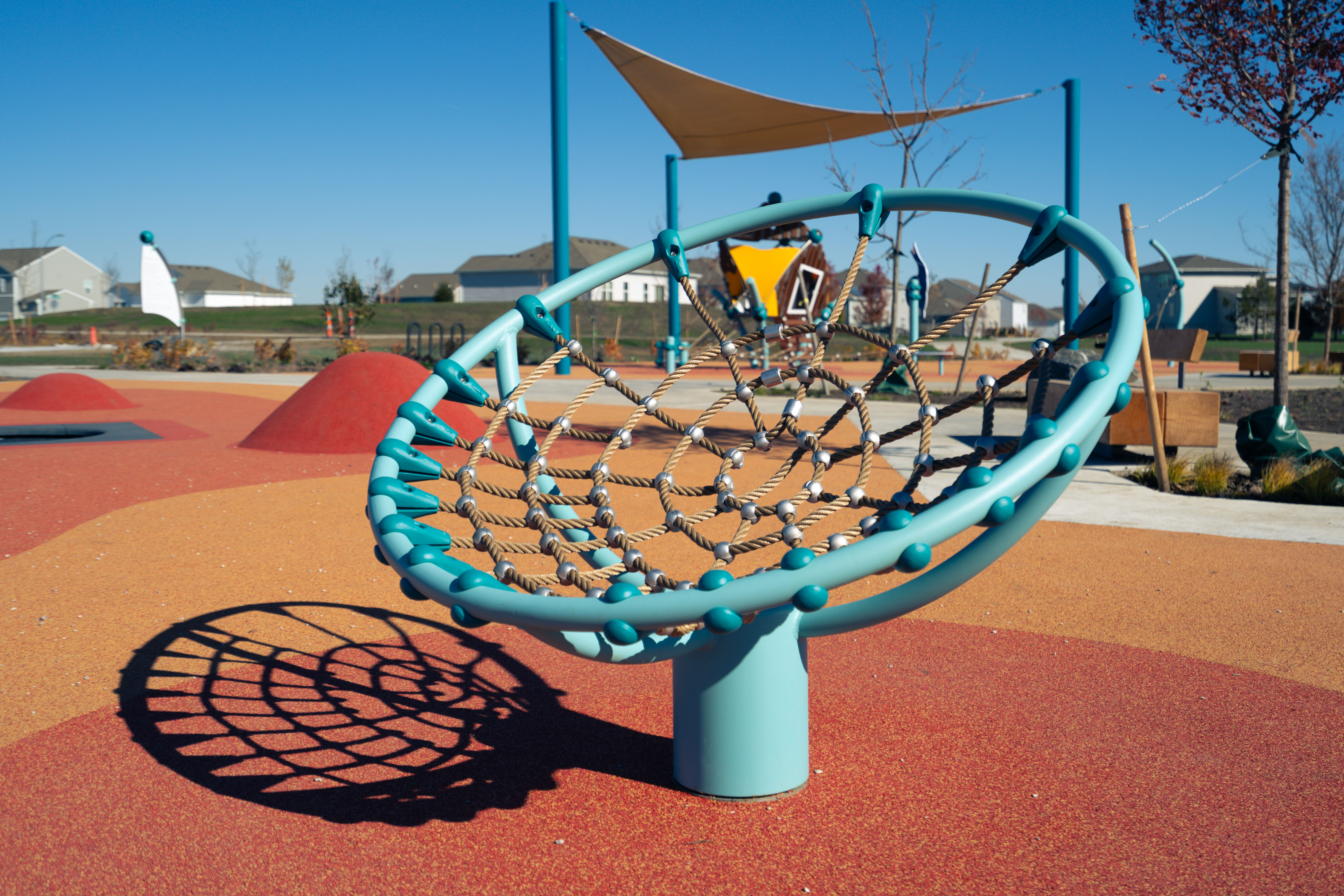 From a ground-level trampoline that accommodates mobility aids to a transfer-height bowl swing, every feature supports universal play. With added amenities like pickleball and basketball courts, shaded seating, and thoughtfully crafted landscaping, Painted Woods West Park has quickly become a cherished destination for families to explore, play, and connect.