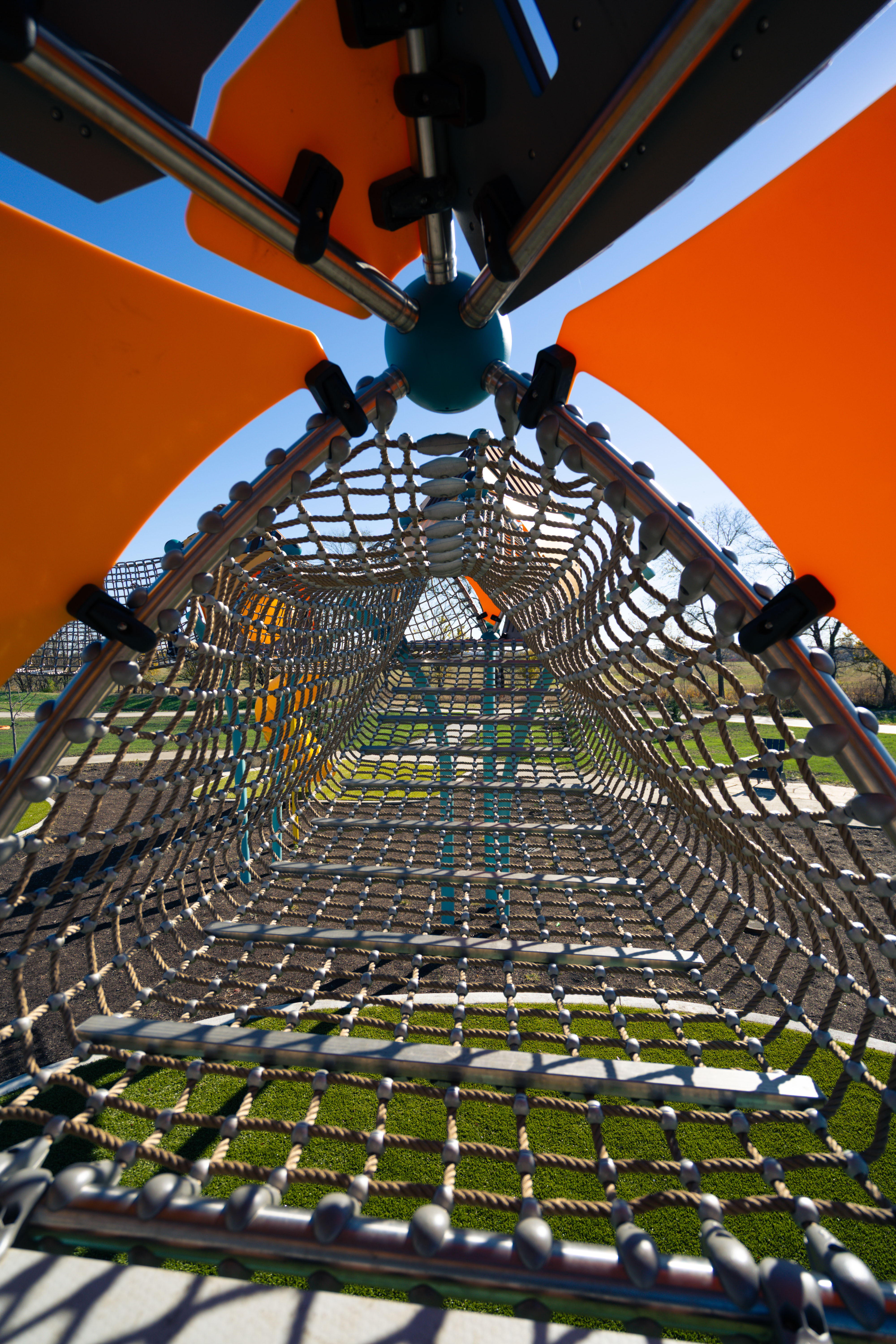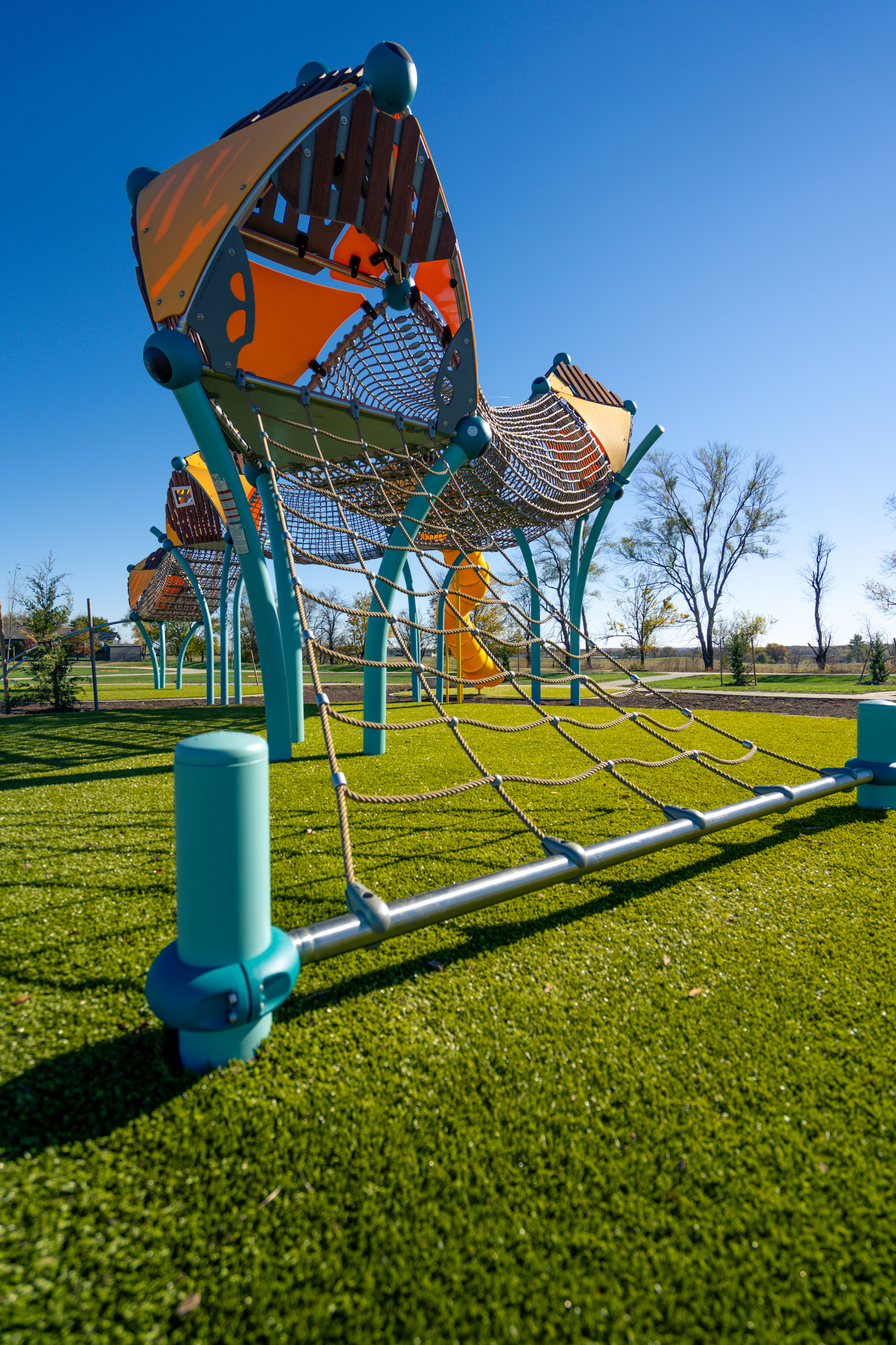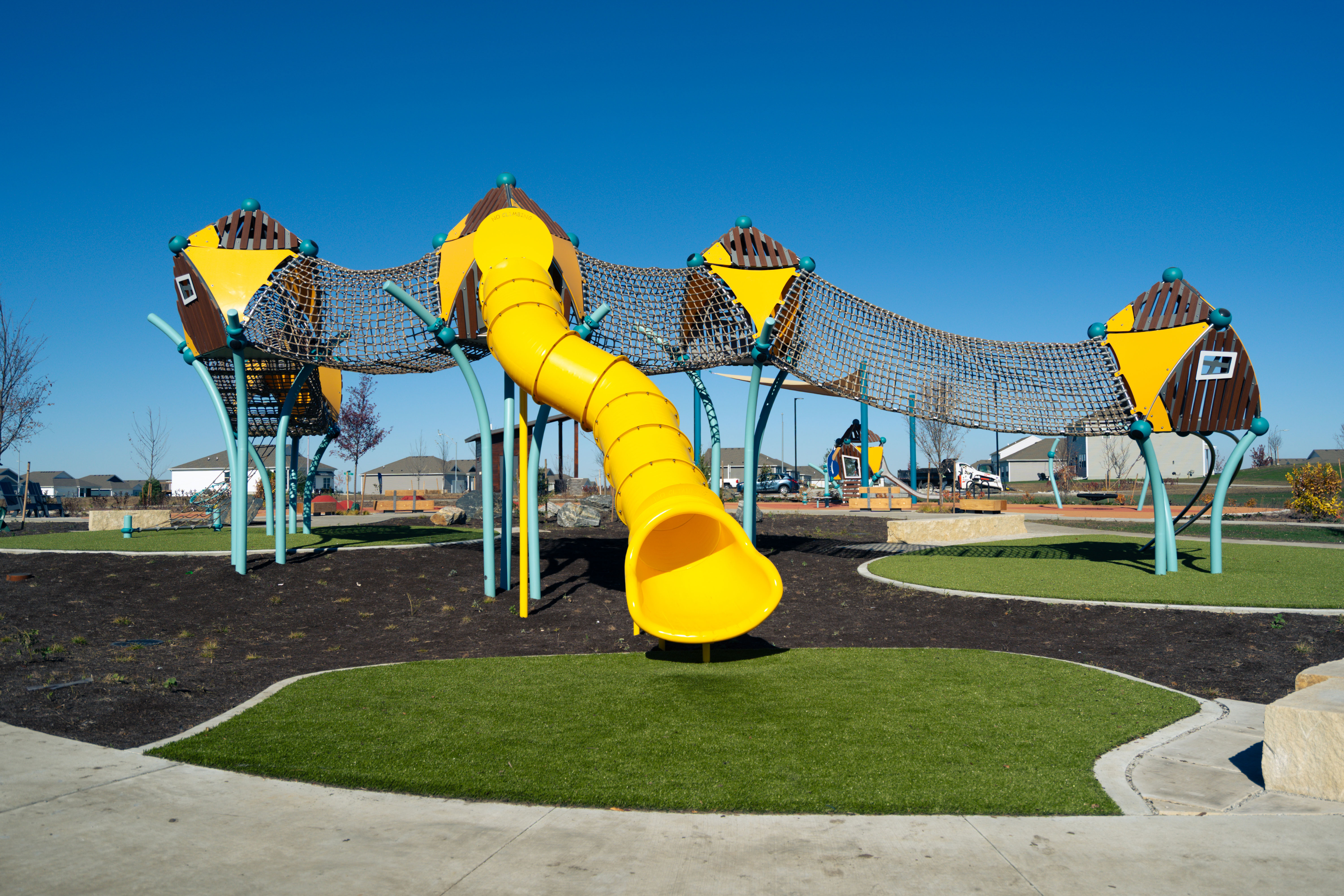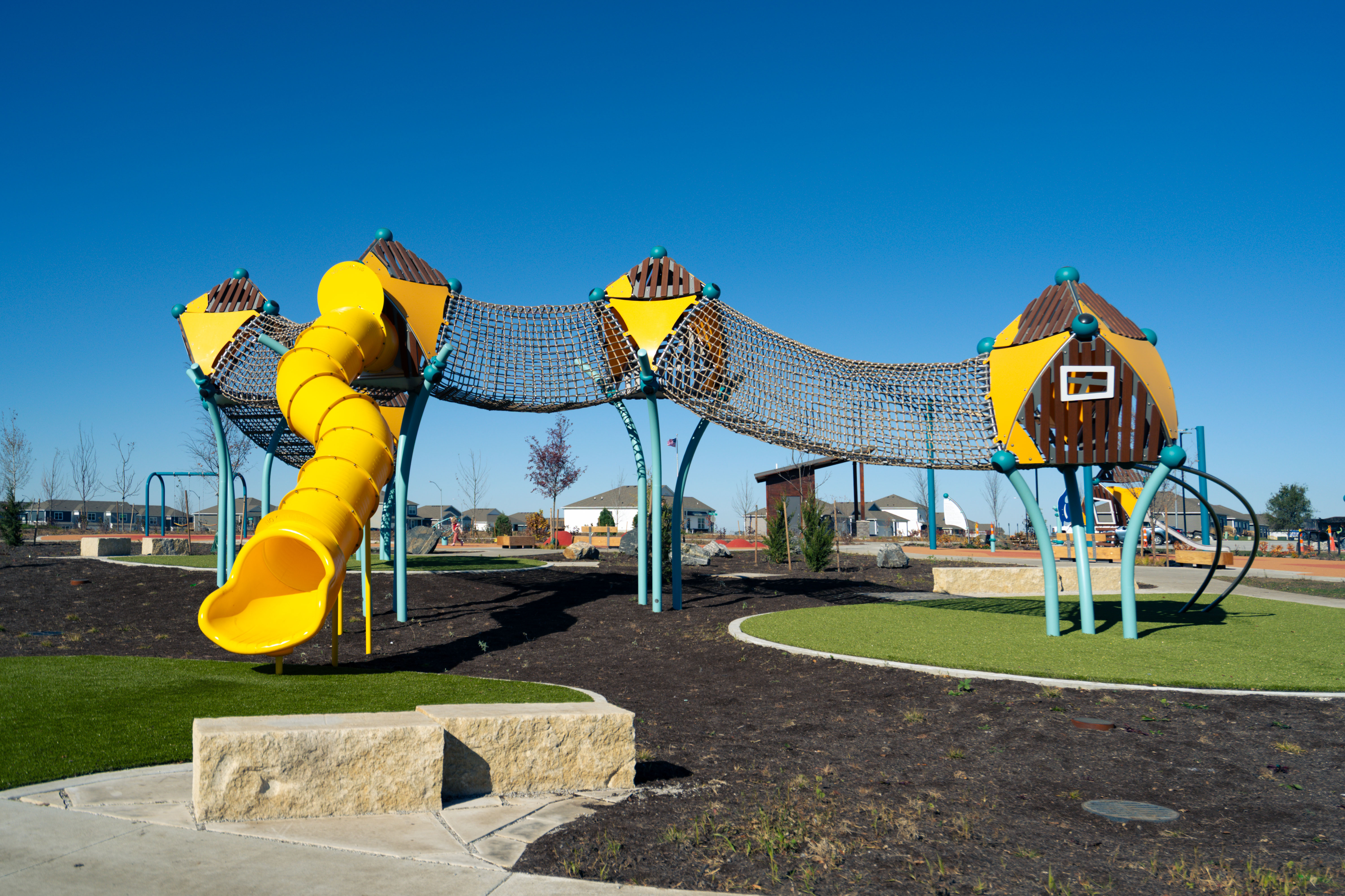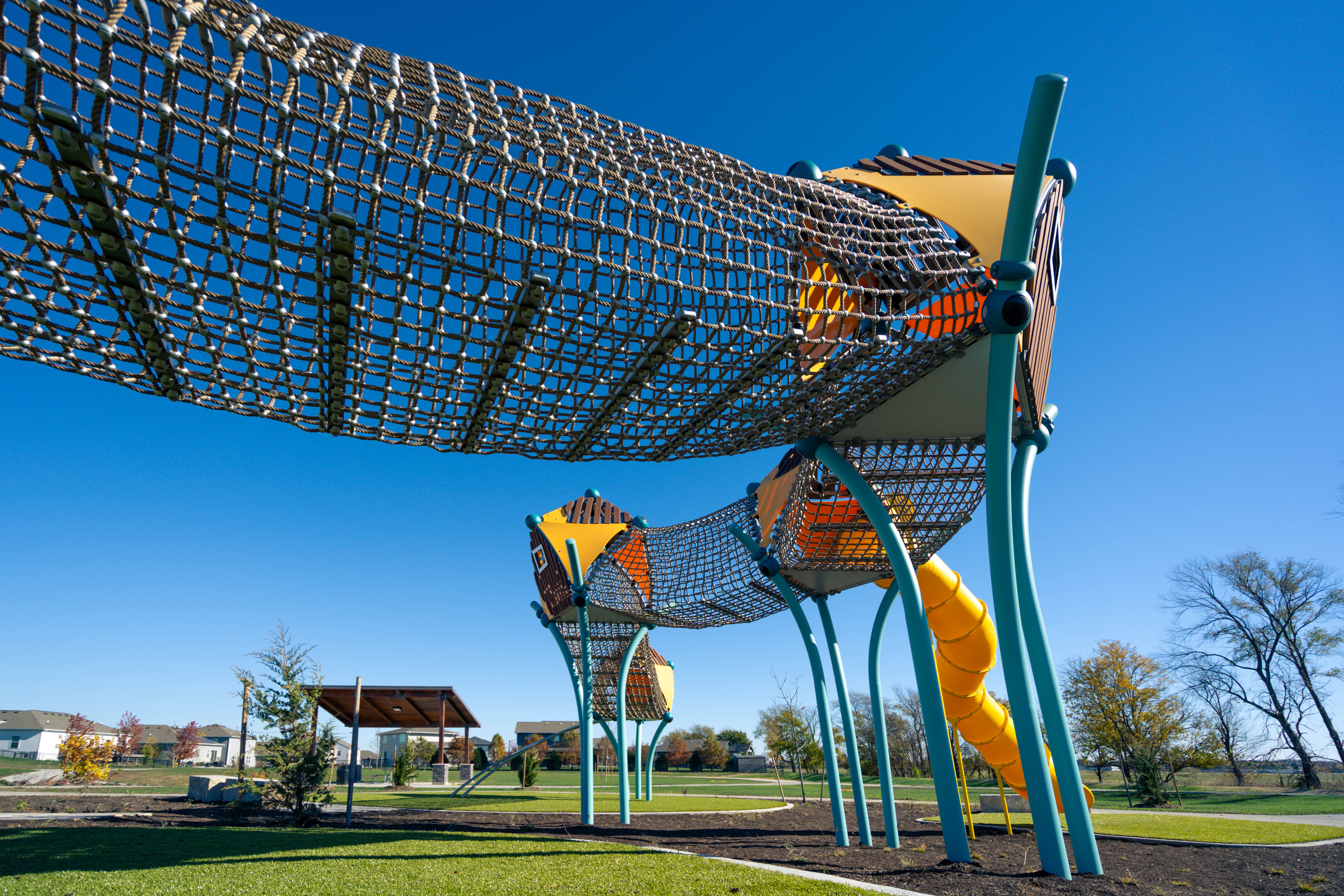 From a ground-level trampoline that accommodates mobility aids to a transfer-height bowl swing, every feature supports universal play. With added amenities like pickleball and basketball courts, shaded seating, and thoughtfully crafted landscaping, Painted Woods West Park has quickly become a cherished destination for families to explore, play, and connect.